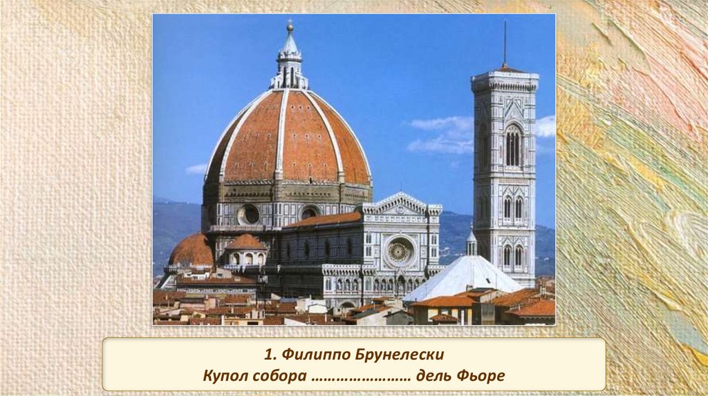 1. Филиппо БрунелескиКупол собора …………………… дель Фьоре