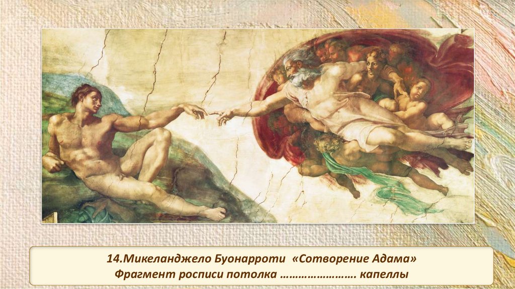 14.Микеланджело Буонарроти «Сотворение Адама»Фрагмент росписи потолка ……………………. капеллы
