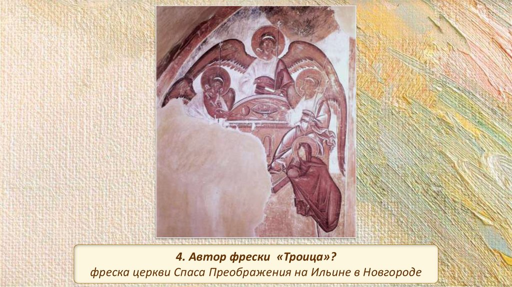 4. Автор фрески «Троица»?фреска церкви Спаса Преображения на Ильине в Новгороде