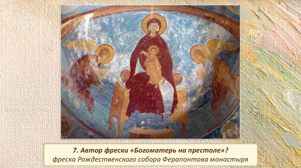 7. Автор фрески «Богоматерь на престоле»?фреска Рождественского собора Ферапонтова монастыря