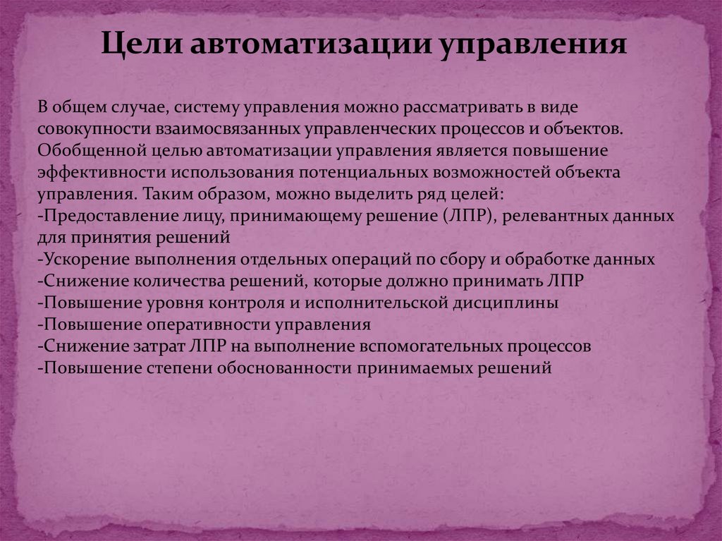 Обобщенной целью автоматизации управления является повышение