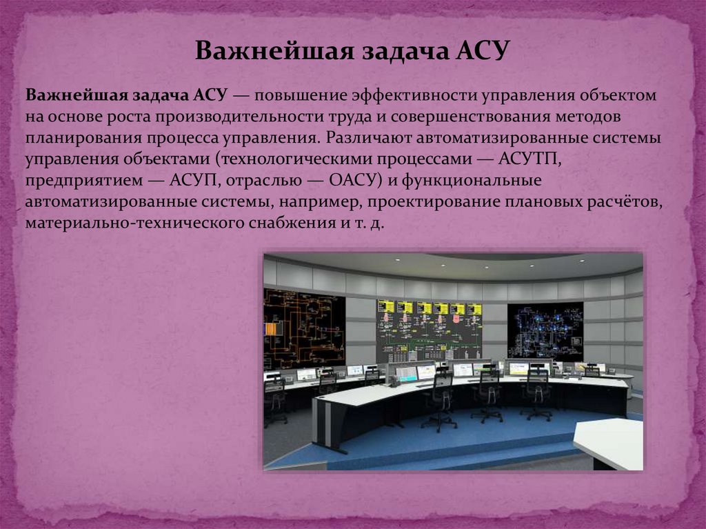 Важнейшая задача АСУВажнейшая задача АСУ — повышение эффективности управления объектом
