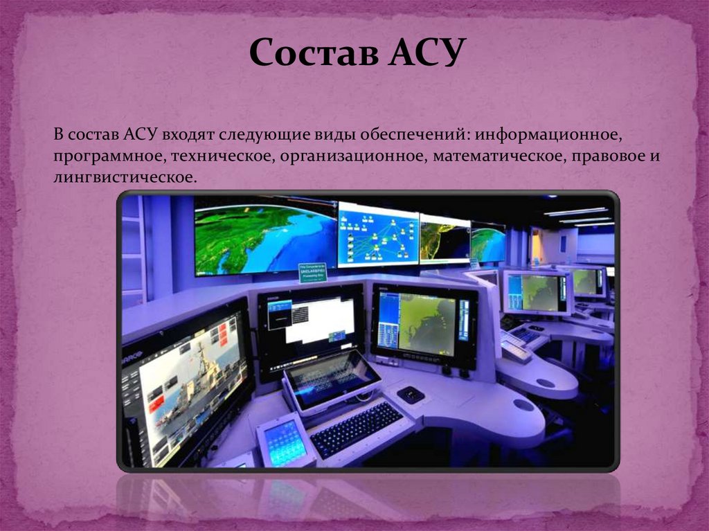Состав АСУВ состав АСУ входят следующие виды обеспечений: информационное,