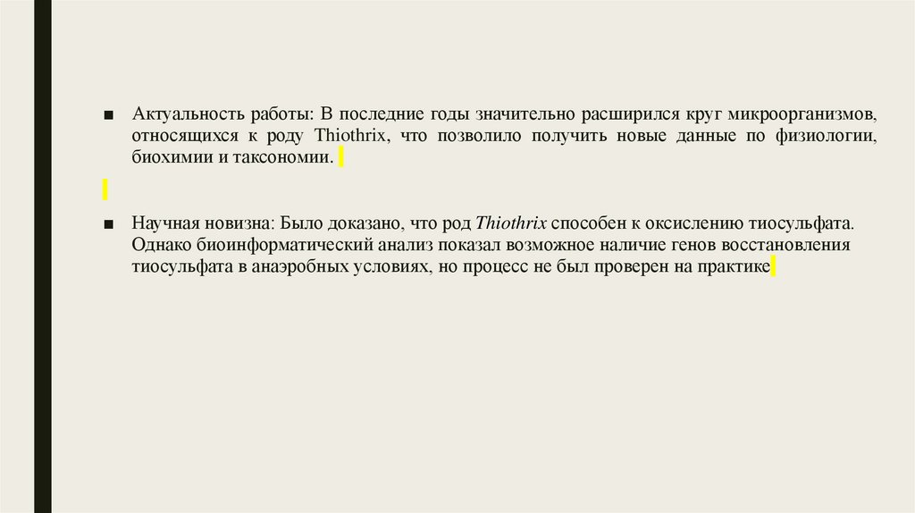 ■ Научная новизна: Было доказано, что род Thiothrix способен к оксислению тиосульфата.