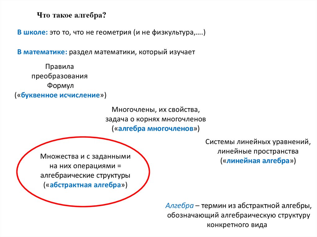 Что такое алгебра?В школе: это то, что не геометрия (и не физкультура,….)
