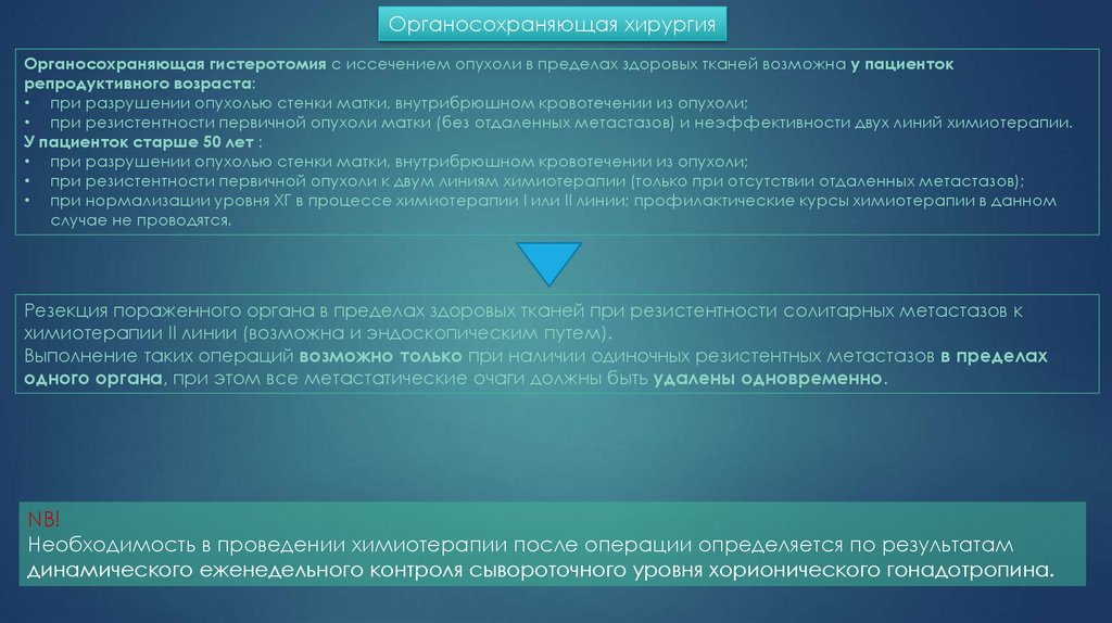 Органосохраняющая хирургияОрганосохраняющая гистеротомия с иссечением опухоли в пределах здоровых тканей возможна у пациенток