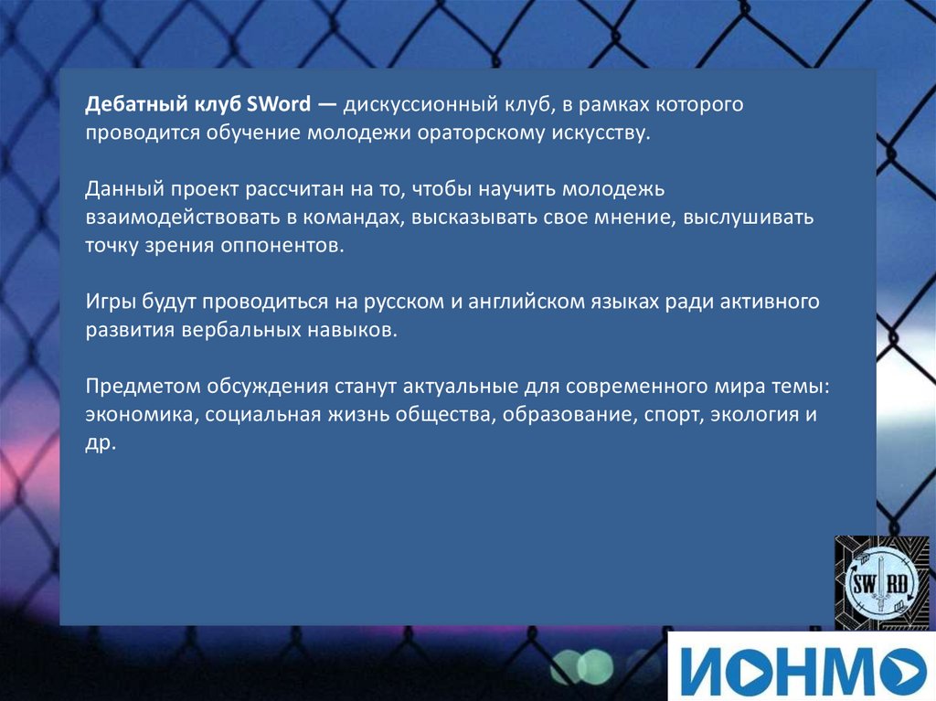Дебатный клуб SWord — дискуссионный клуб, в рамках которогопроводится обучение молодежи ораторскому искусству.