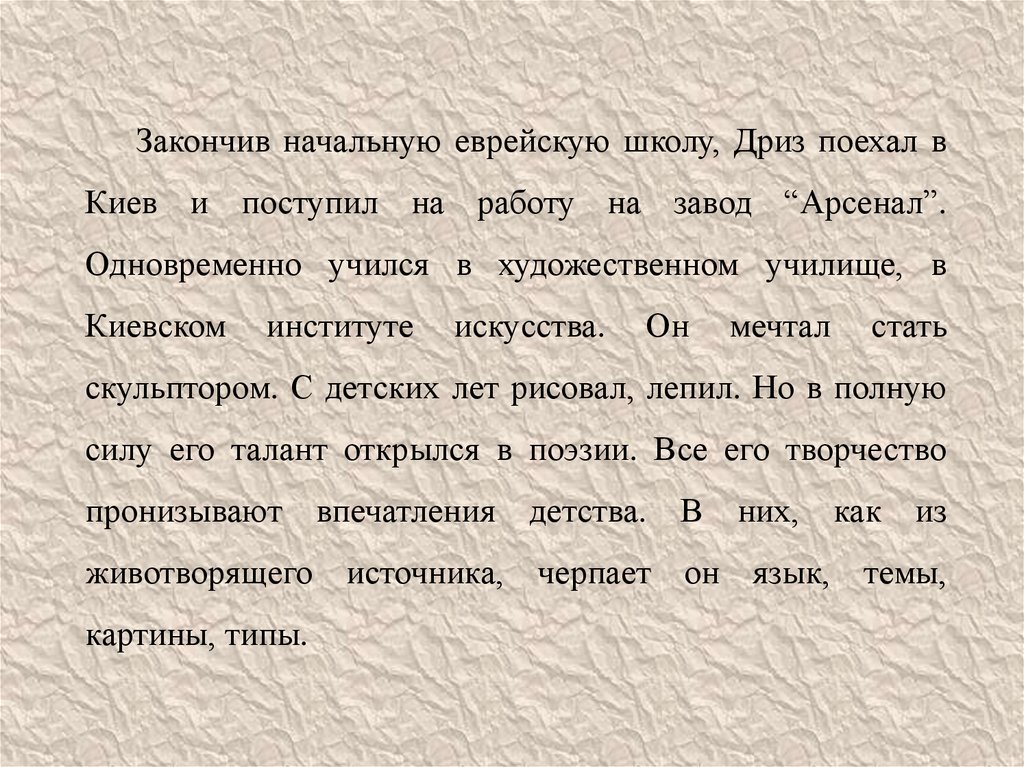 Закончив начальную еврейскую школу, Дриз поехал вКиев и поступил на работу на завод “Арсенал”.