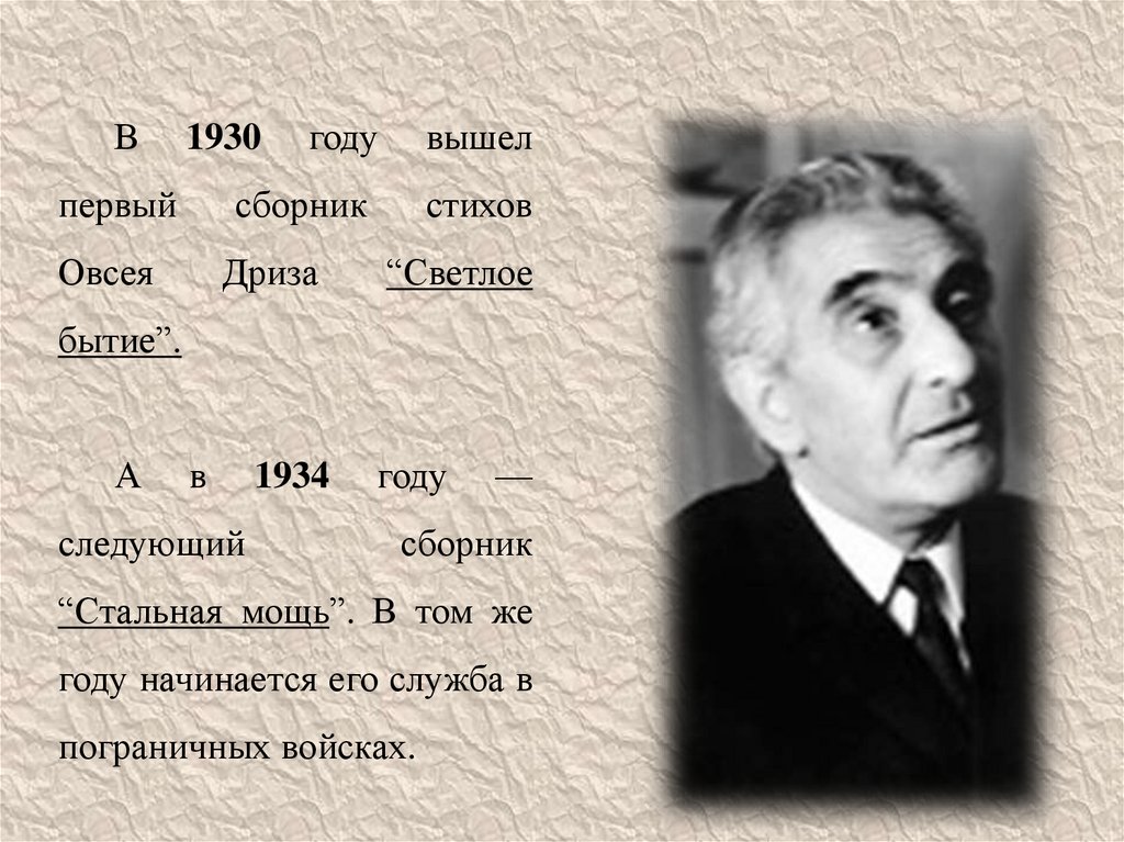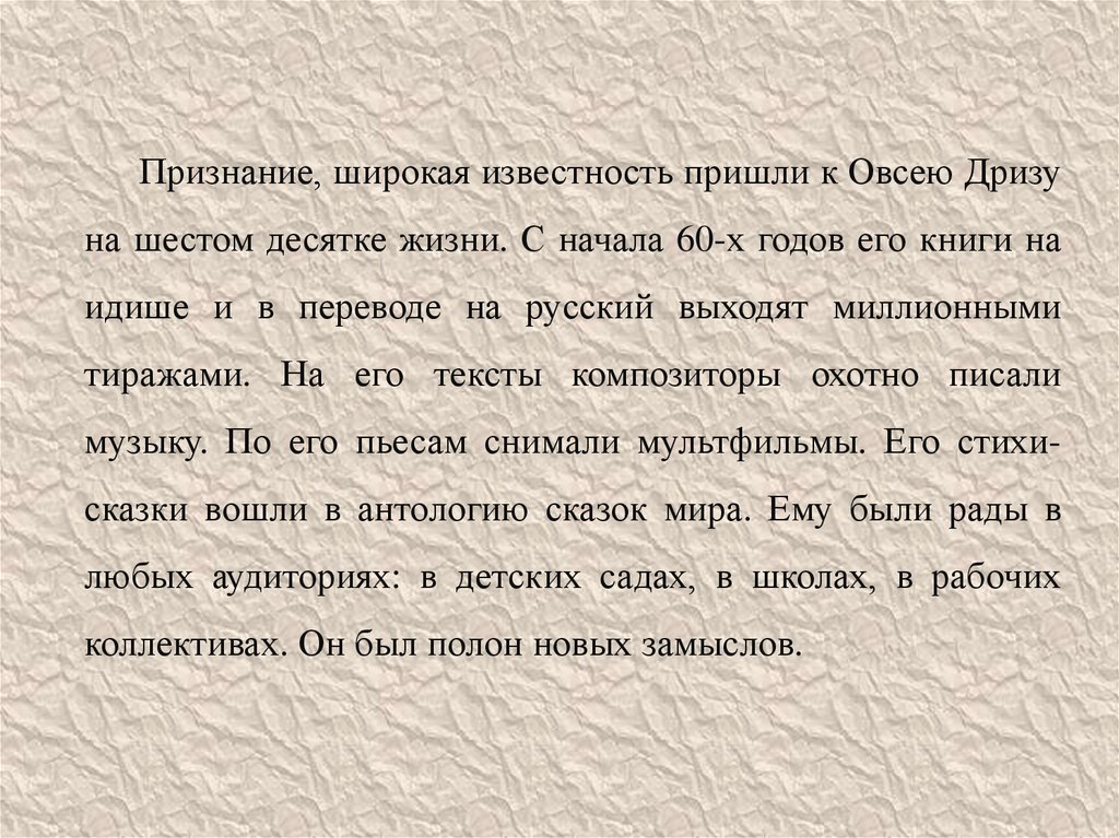 Признание, широкая известность пришли к Овсею Дризуна шестом десятке жизни. С начала 60-х годов его книги на