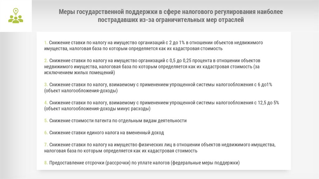 Меры государственной поддержки в сфере налогового регулирования наиболеепострадавших из-за ограничительных мер отраслей