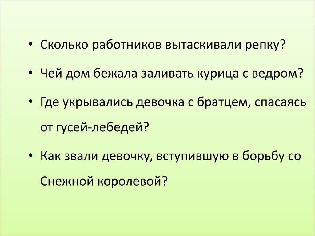 • Сколько работников вытаскивали репку?• Чей дом бежала заливать курица с ведром?