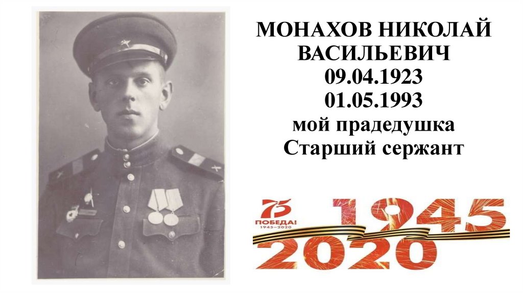 МОНАХОВ НИКОЛАЙ ВАСИЛЬЕВИЧ 09.04.1923 01.05.1993 мой прадедушка Старший сержант