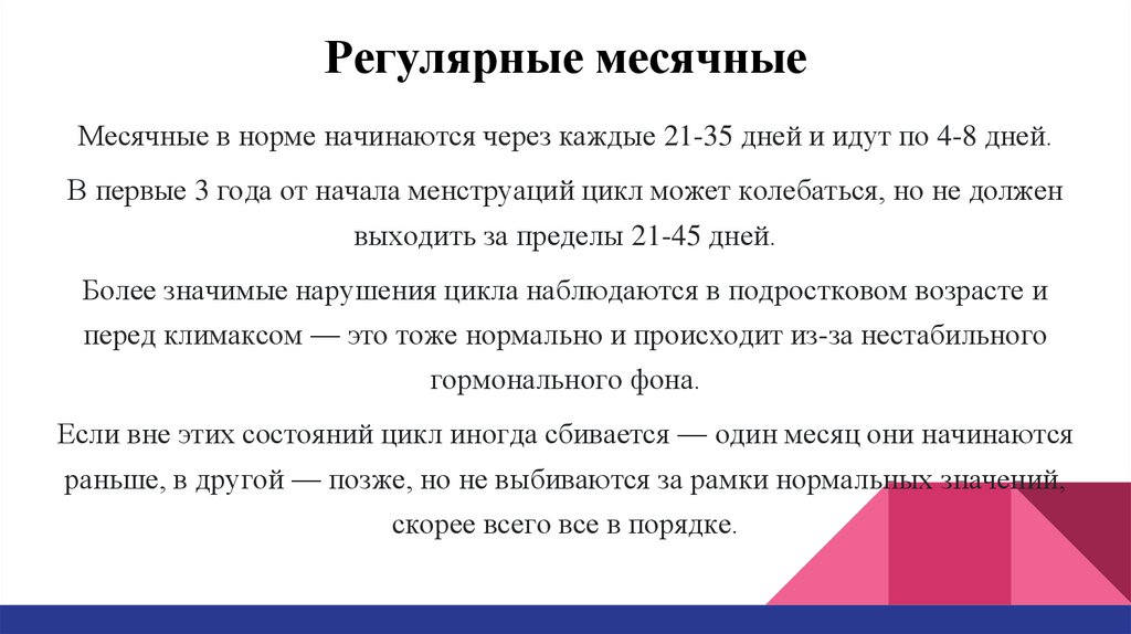 Регулярные месячныеМесячные в норме начинаются через каждые 21-35 дней и идут по 4-8 дней.