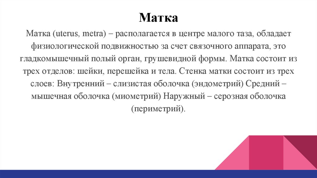 гладкомышечный полый орган, грушевидной формы. Матка состоит из