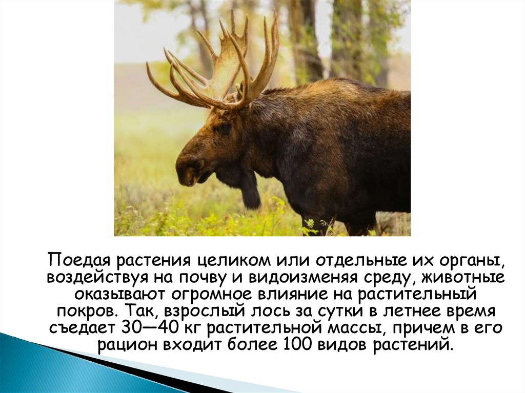 Поедая растения целиком или отдельные их органы,воздействуя на почву и видоизменяя среду, животные