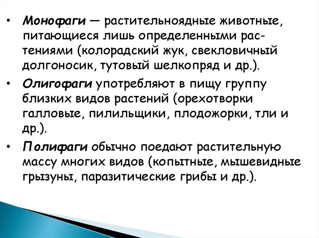 • Монофаги — растительноядные животные,питающиеся лишь определенными растениями (колорадский жук, свекловичный