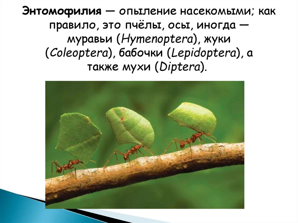 Энтомофилия — опыление насекомыми; какправило, это пчёлы, осы, иногда —