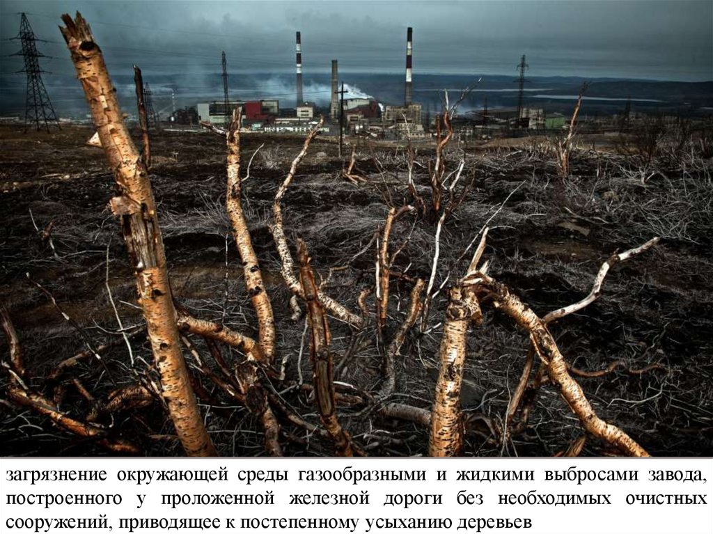 загрязнение окружающей среды газообразными и жидкими выбросами завода,построенного у проложенной железной дороги без необходимых очистных