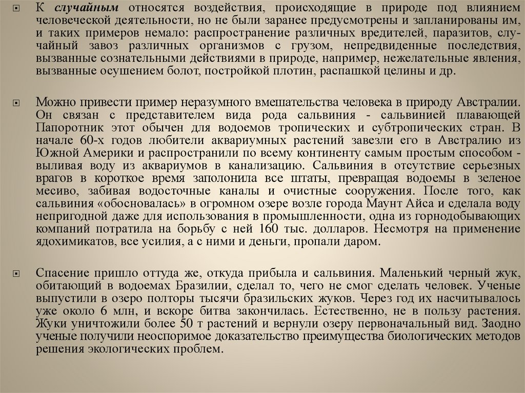 являются положительными, но нередко носят отрицательный характер, например, необдуманное расселение многих животных, растений, микроорганизмов, хищническое