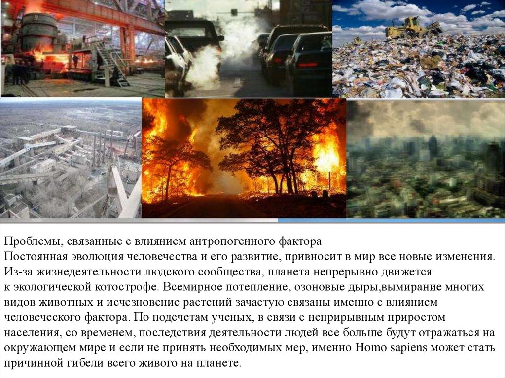 Проблемы, связанные с влиянием антропогенного фактораПостоянная эволюция человечества и его развитие, привносит в мир все новые изменения.