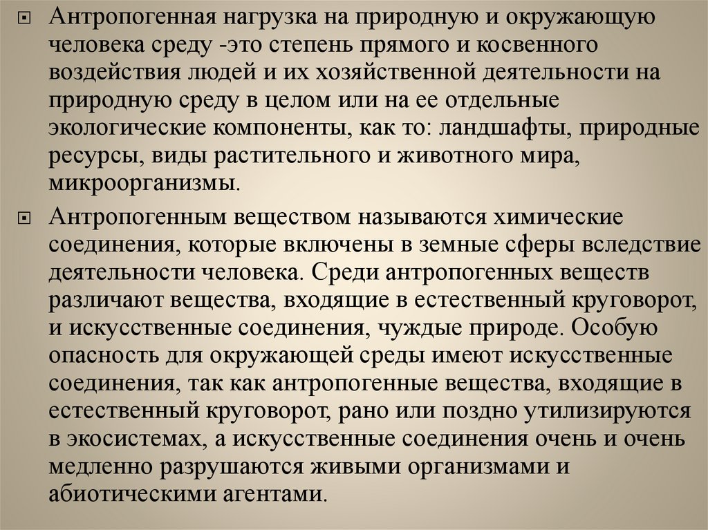 Антропогенная нагрузка на природную и окружающуючеловека среду -это степень прямого и косвенного