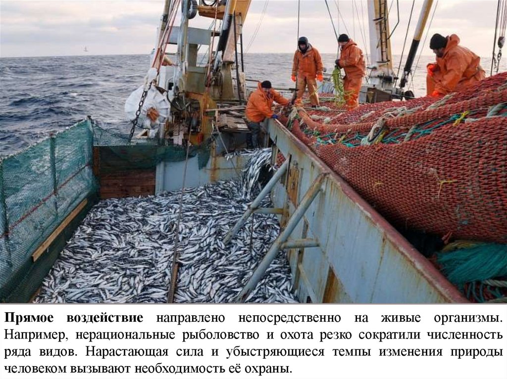 Прямое воздействие направлено непосредственно на живые организмы.Например, нерациональные рыболовство и охота резко сократили численность