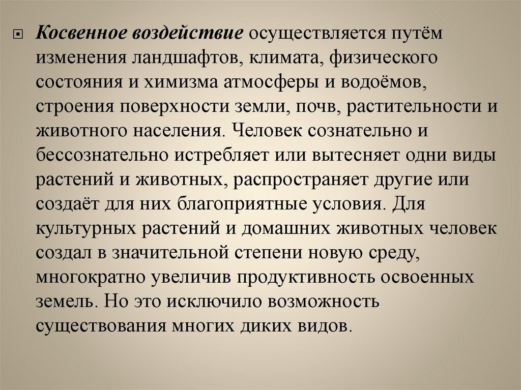 Косвенное воздействие осуществляется путёмизменения ландшафтов, климата, физического