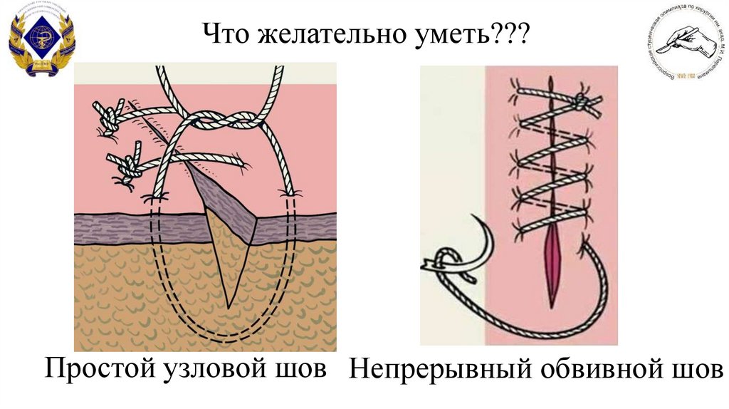 Что желательно уметь???Простой узловой шов Непрерывный обвивной шов