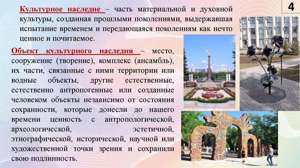 Культурное наследие – часть материальной и духовнойкультуры, созданная прошлыми поколениями, выдержавшая