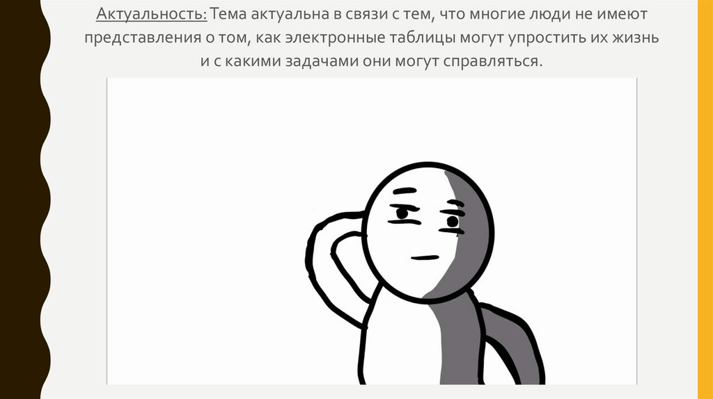 Актуальность: Тема актуальна в связи с тем, что многие люди не имеютпредставления о том, как электронные таблицы могут упростить их жизнь