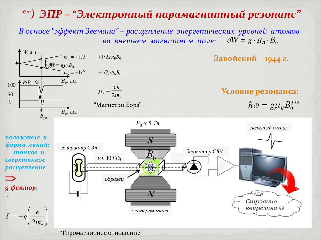 **) ЭПР – “Электронный парамагнитный резонанс”В основе “эффект Зеемана” – расщепление энергетических уровней атомов