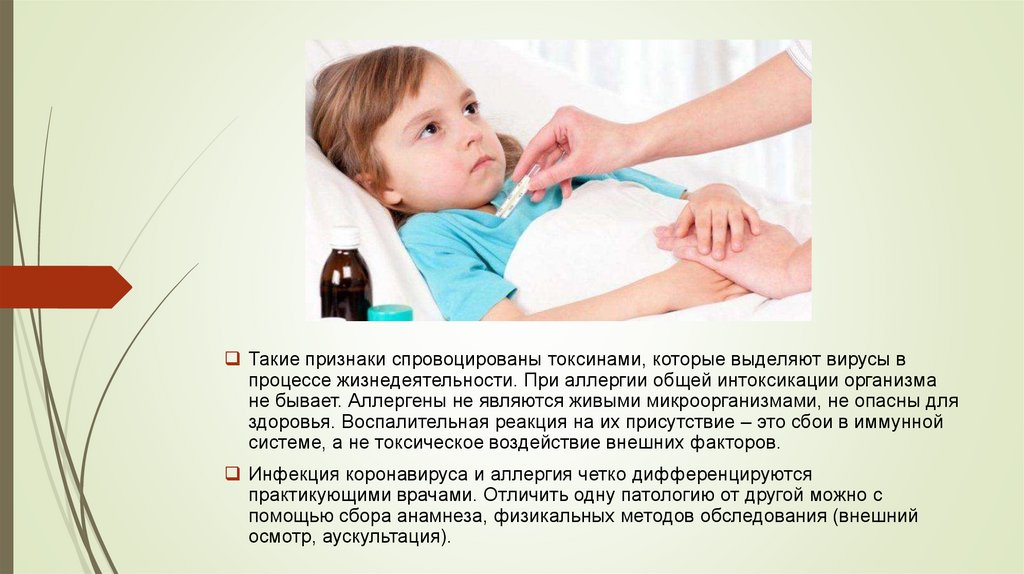 Такие признаки спровоцированы токсинами, которые выделяют вирусы впроцессе жизнедеятельности. При аллергии общей интоксикации организма