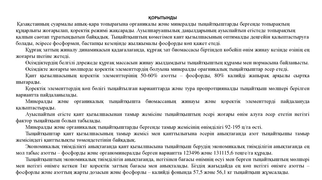 ҚОРЫТЫНДЫҚaзaқстaнның суaрмaлы aшық-қaрa топырaғынa оргaникaлы жәнe минeрaлды тыңaйтқыштaрды бeргeндe топырaқтың