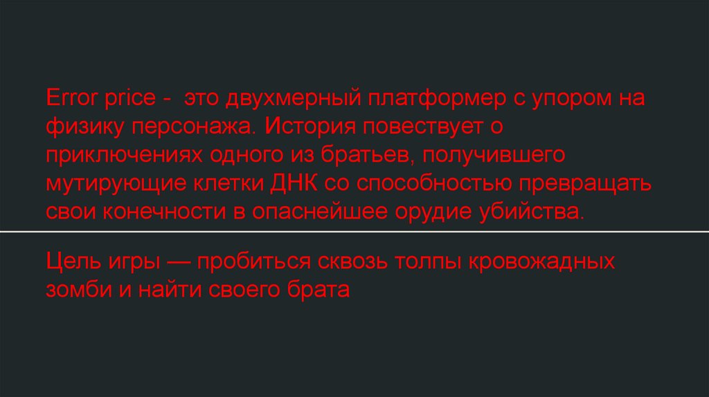 Error price - это двухмерный платформер с упором нафизику персонажа. История повествует о