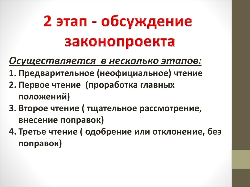 Осуществляется в несколько этапов:1. Предварительное (неофициальное) чтение