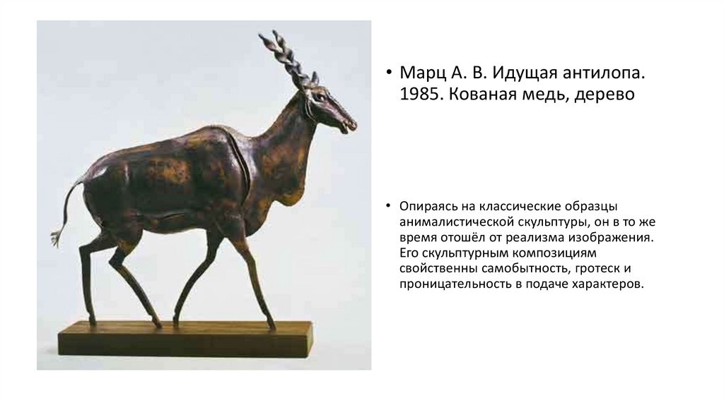 • Марц А. В. Идущая антилопа.1985. Кованая медь, дерево