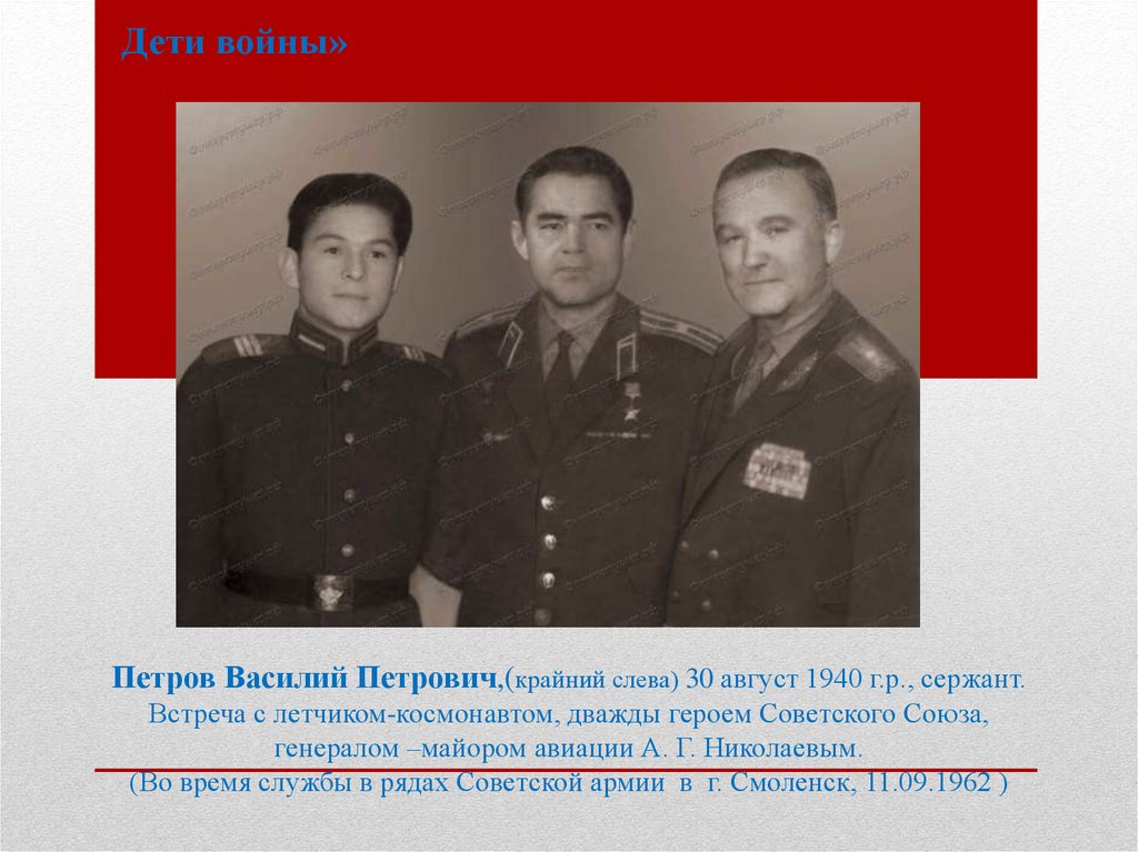 Дети войны»Петров Василий Петрович,(крайний слева) 30 август 1940 г.р., сержант.