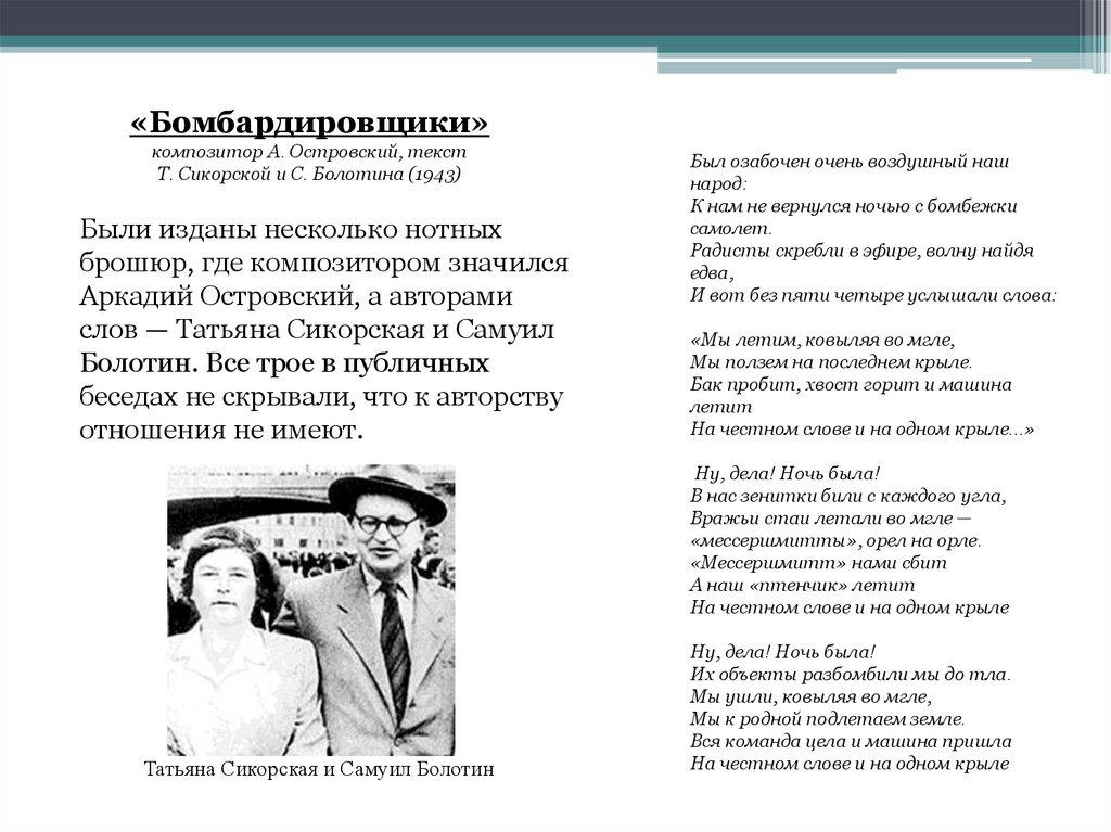 В 1943 году в эфире Всесоюзного радиопрозвучала песня «Бомбардировщики» в