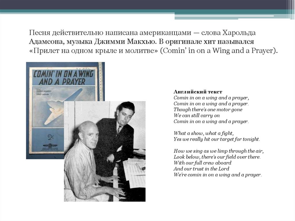 Песня действительно написана американцами — слова ХарольдаАдамсона, музыка Джимми Макхью. В оригинале хит назывался