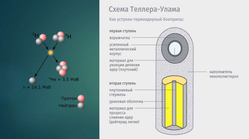 Д. В сжатом и разогретом дейтериде лития-6 происходит реакция слияния, испускаемый