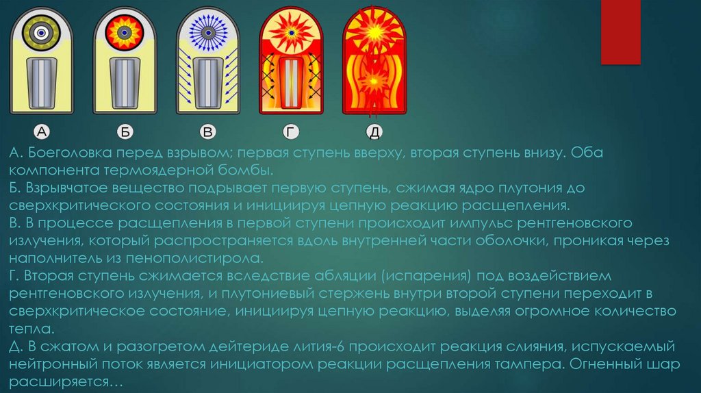 А. Боеголовка перед взрывом; первая ступень вверху, вторая ступень внизу. Обакомпонента термоядерной бомбы.