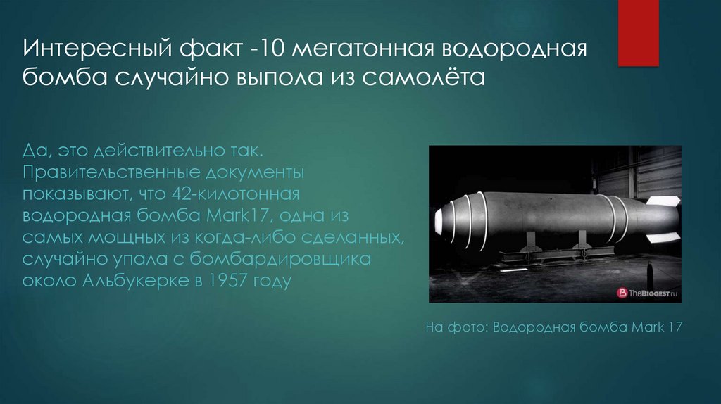 Интересный факт -10 мегатонная водороднаябомба случайно выпола из самолёта