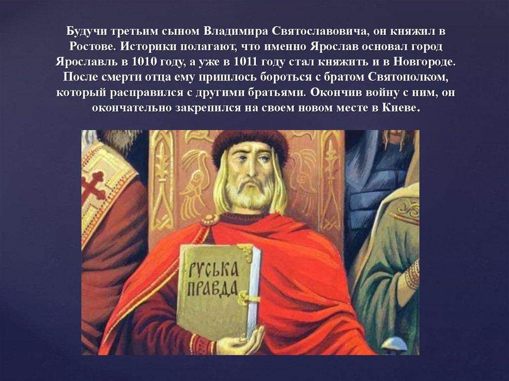 2. Будучи третьим сыном Владимира Святославовича, он княжил в Ростове. Историки полагают, что именно Ярослав основал город