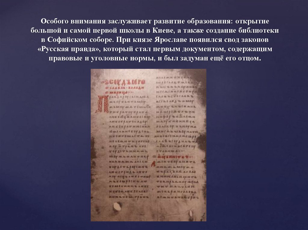 Софийском соборе. При князе Ярославе появился свод законов«Русская правда», который стал первым документом, содержащим