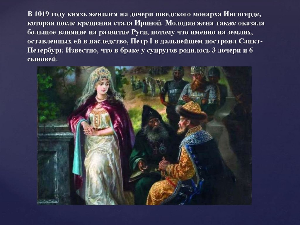 8. В 1019 году князь женился на дочери шведского монарха Ингигерде, которая после крещения стала Ириной. Молодая жена также