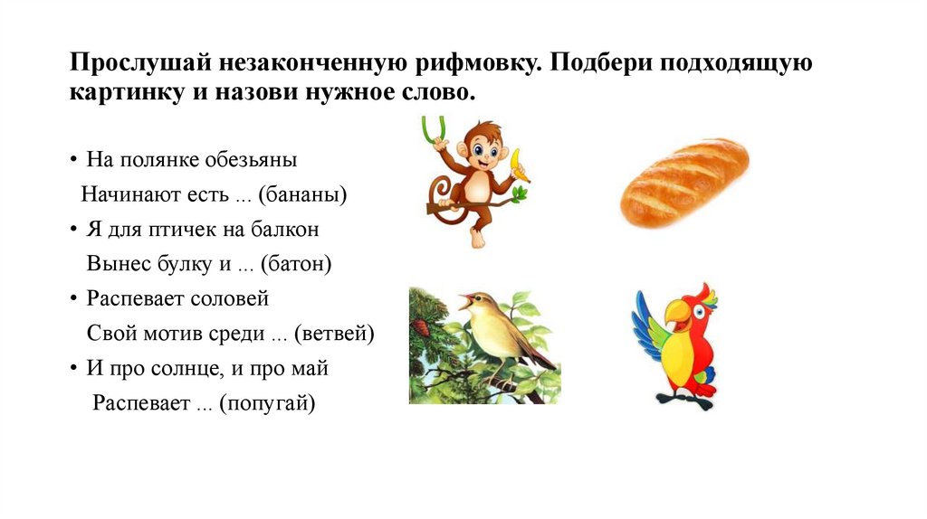 Прослушай незаконченную рифмовку. Подбери подходящуюкартинку и назови нужное слово.