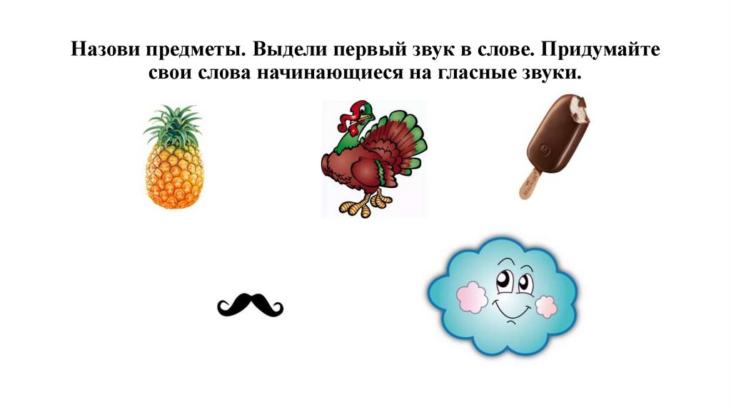 Назови предметы. Выдели первый звук в слове. Придумайтесвои слова начинающиеся на гласные звуки.