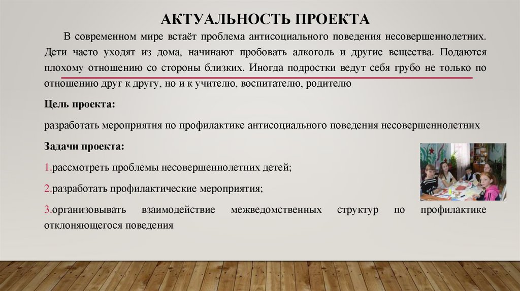 АКТУАЛЬНОСТЬ ПРОЕКТАВ современном мире встаёт проблема антисоциального поведения несовершеннолетних.