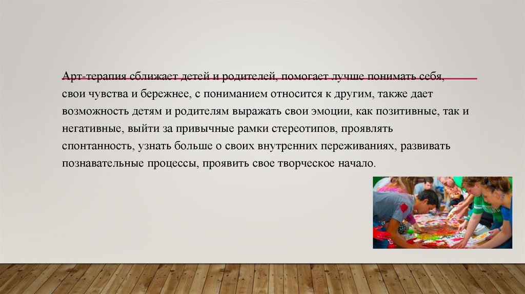 Арт-терапия сближает детей и родителей, помогает лучше понимать себя,свои чувства и бережнее, с пониманием относится к другим, также дает