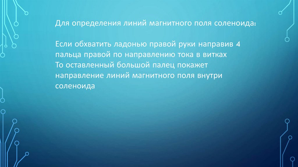 Для определения линий магнитного поля соленоида:Если обхватить ладонью правой руки направив 4